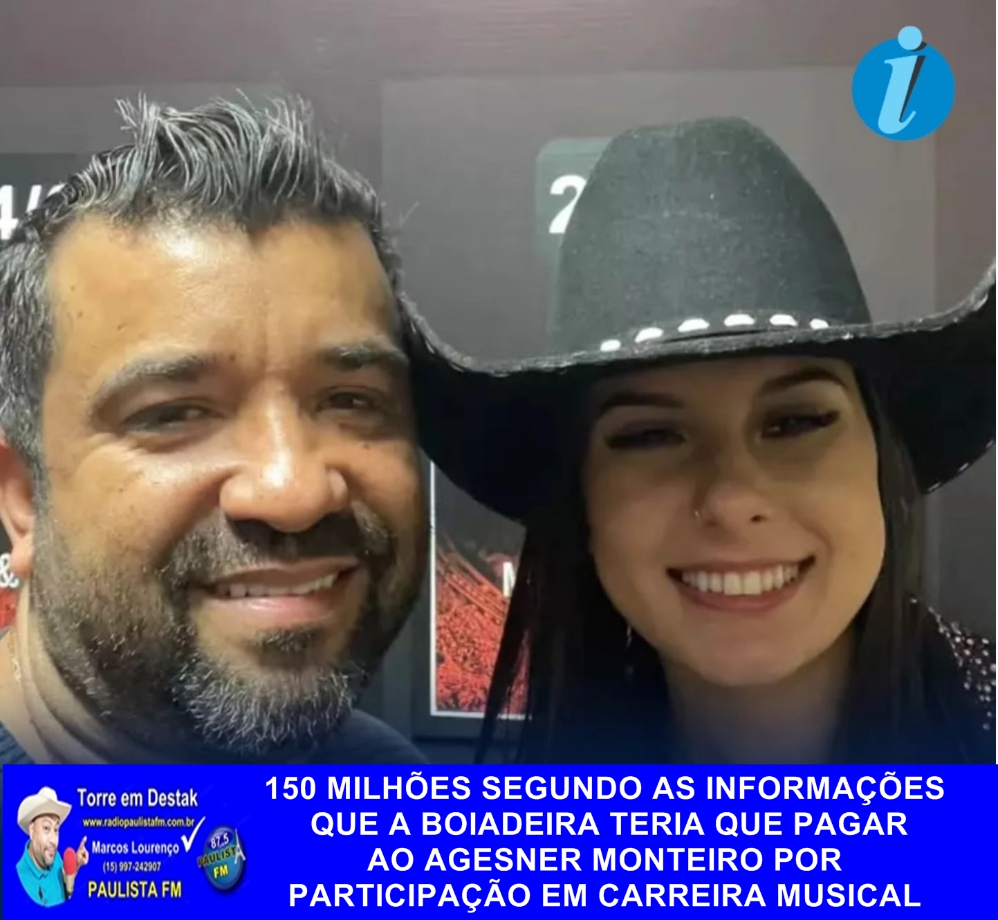 150 MILHÕES SEGUNDO AS INFORMAÇÕES QUE A BOIADEIRA TERIA QUE PAGAR AO AGESNER MONTEIRO POR PARTICIPAÇÃO EM CARREIRA MUSICAL