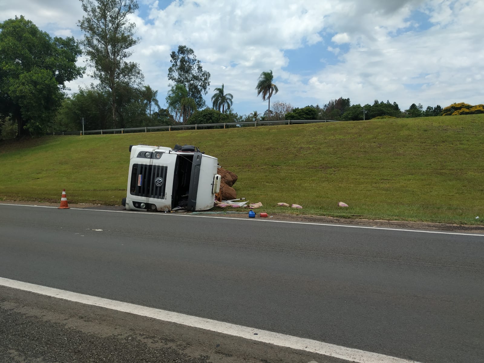 do lado da pista no canteiro central. A carreta ficou toda retorcida.