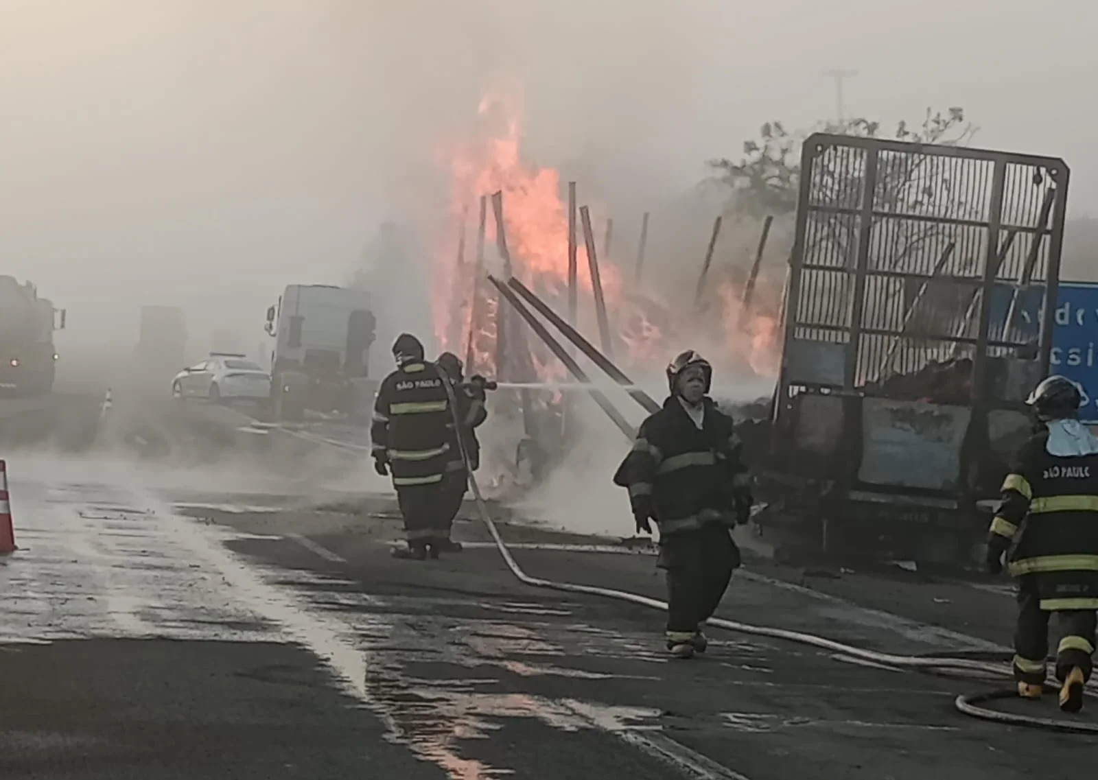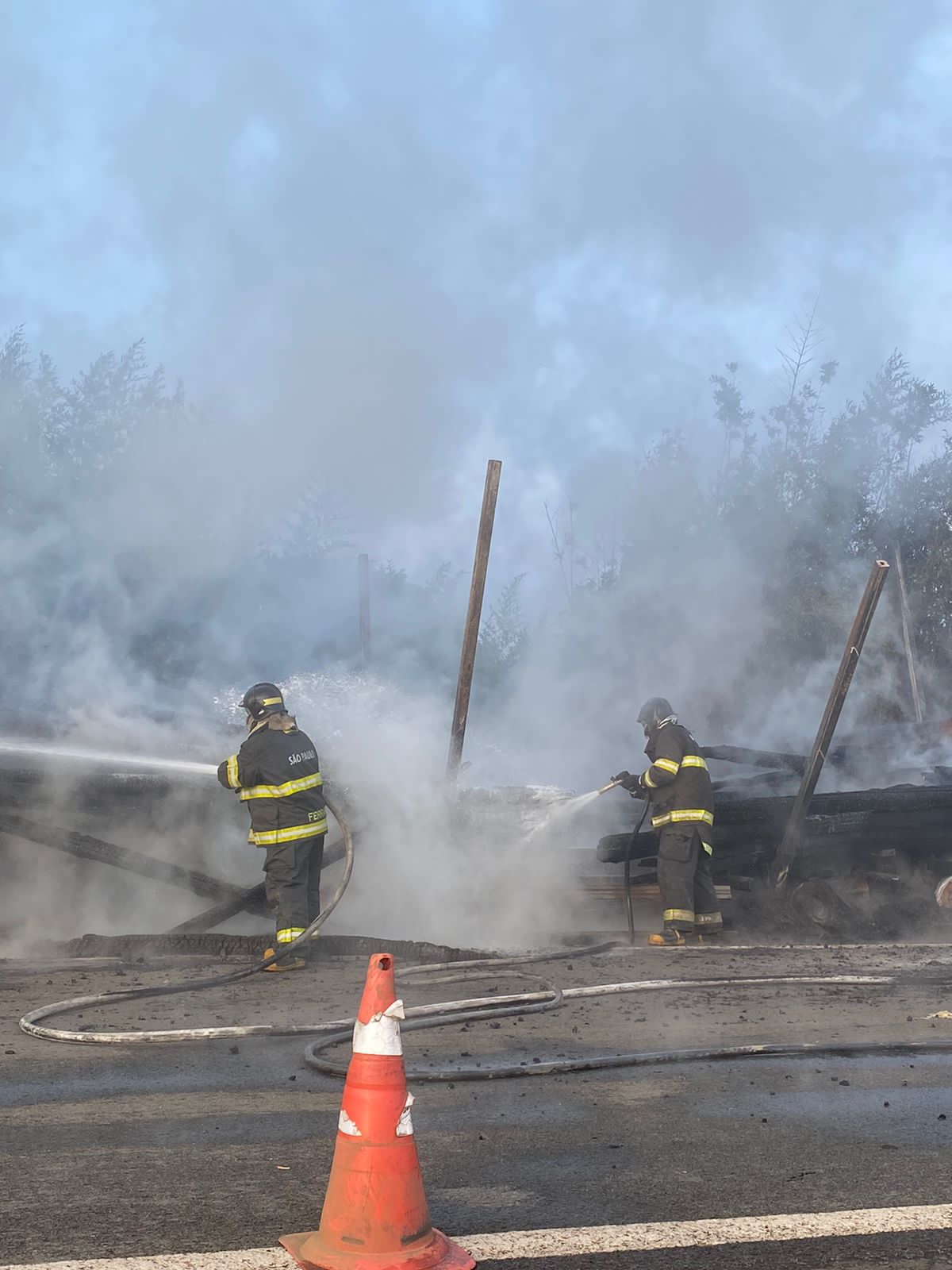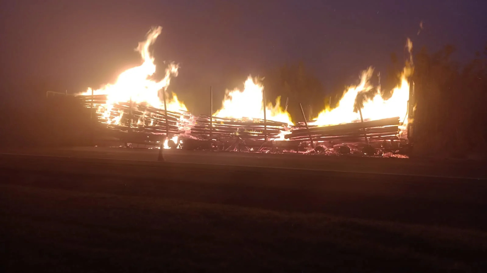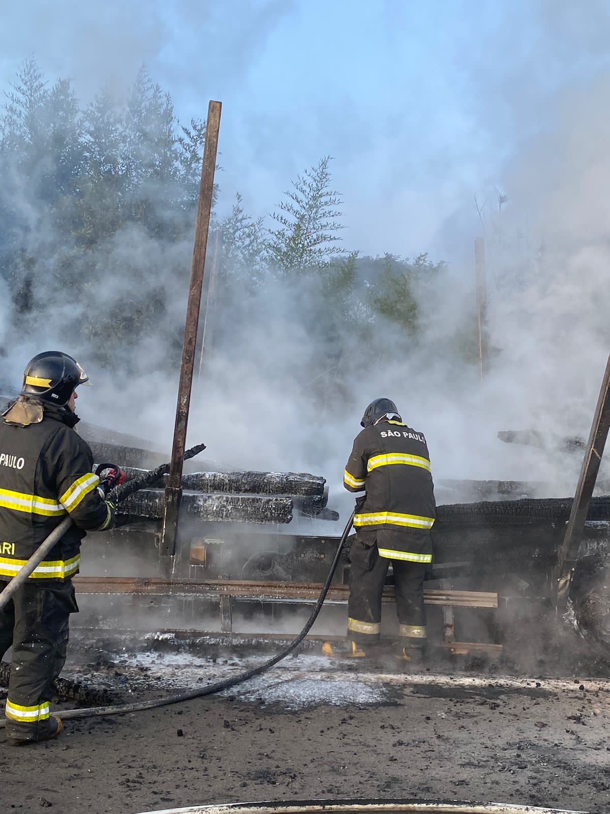 O Corpo de Bombeiros foi acionado para controle das chamas. Os trabalhos duraram a madrugada toda e parte da manhã, já que há o rescaldo na carreta, já que algumas toras de madeira ainda estavam em chamas.