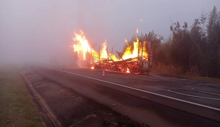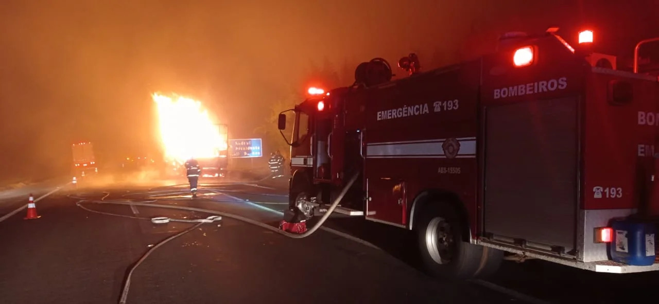 Um treminhao que transportava madeira pegou fogo na madrugada desta quarta-feira, 30 de agosto, enquanto trafegava pela Rodovia Castello Branco (SP 280), em Itatinga.