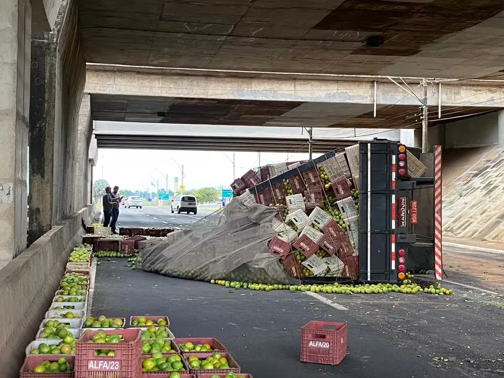 Uma carreta carregada com mais de 21 toneladas de laranja tombou no final da tarde desta quinta-feira (30) na Avenida Nações Unidas, em Bauru (SP). A via ficou parcialmente interditada.