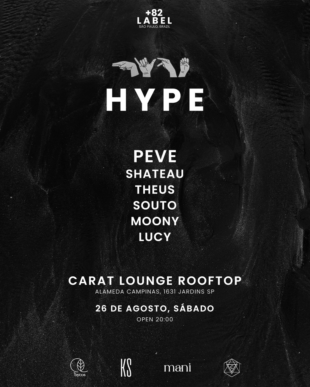 +82 Label retorna com a terceira edição de sua festa, desta vez com a HYPE party, agendada para o dia 26 de agosto às 20h no Carat Rooftop. A festa terá um line-up de peso do cenário eletrônico, contando com a presença de PEVESHATEAUTheusSoutoMoony Lucy. Os ingressos podem ser adquiridos através deste  link: https://abre.ai/hypeparty