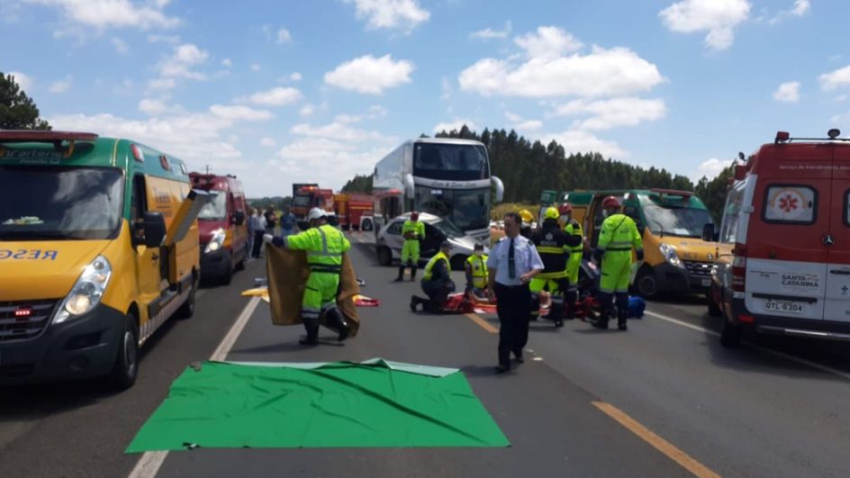 Acidente entre carro e ônibus com 50 pessoas deixa um morto na BR-116, em SC