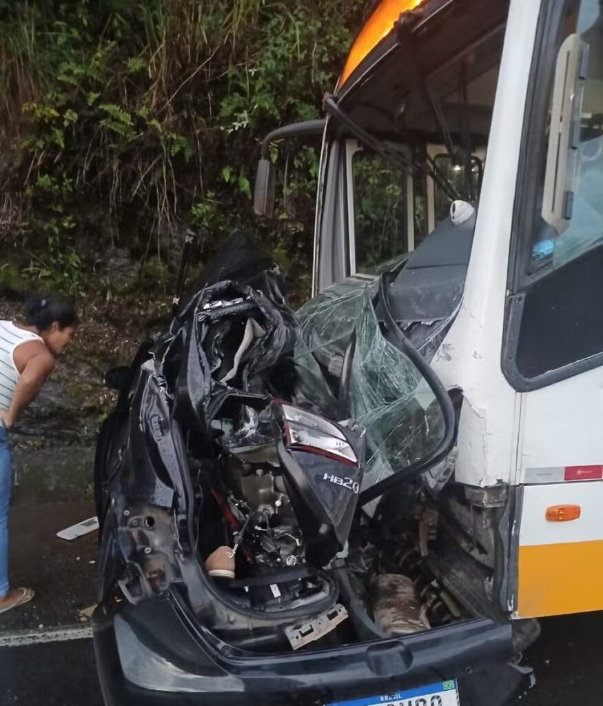 DESTRUIÇÃO: HB20 ficou destruído, após a colisão na frente do ônibus na BR-040/MG. Foto: Divulgação/CBMMG