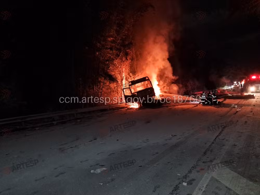 Uma das carretas envolvida no acidente pegou após — Foto: Artesp/Divulgação