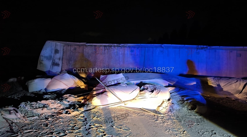 O registro do acidente foi nesta, terça-feira 7/04/2026 18:39 Conforme informações da Polícia Militar Rodoviária no local, a carreta Scania R/450 trafegava sentido oeste pela faixa 2 de rolamento, quando por motivos a esclarecer, perdeu o controle da direção, saiu da pista, atravessou o canteiro central e chocou-se contra a defesa metálica do canteiro central no sentido Leste. Em seguida, tombou sobre as faixas 1 e 2 e acostamento, sentido Leste, onde permaneceu imobilizada.