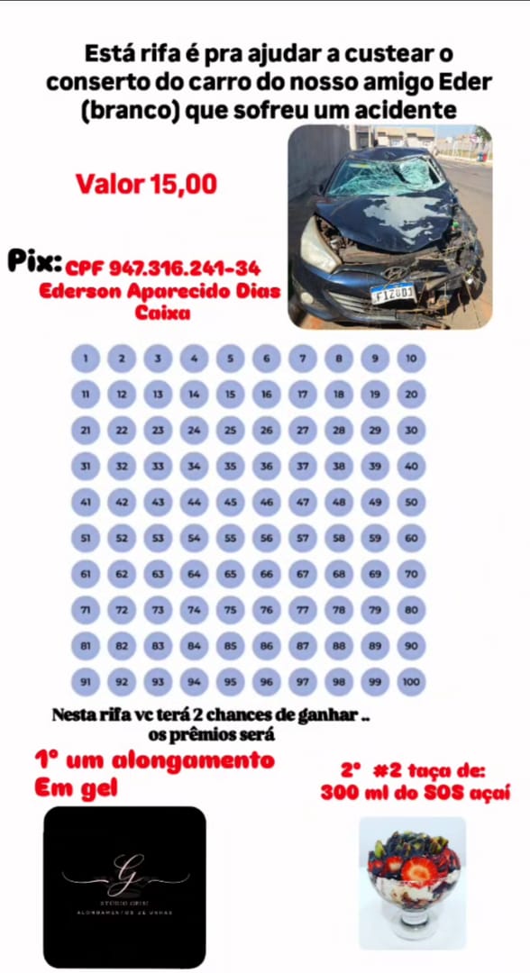 Quem desejar ajudar pode contribuir pela vaquinha, adquirir rifas ou reservar marmitas diretamente pelo WhatsApp de Ederson.