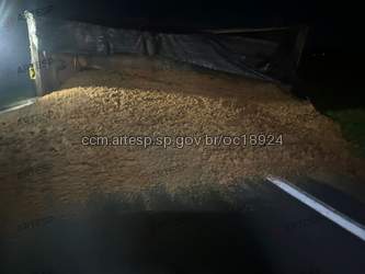 E o complemento tombou. Parte da carga de areia, derramou ao lado da rodovia.