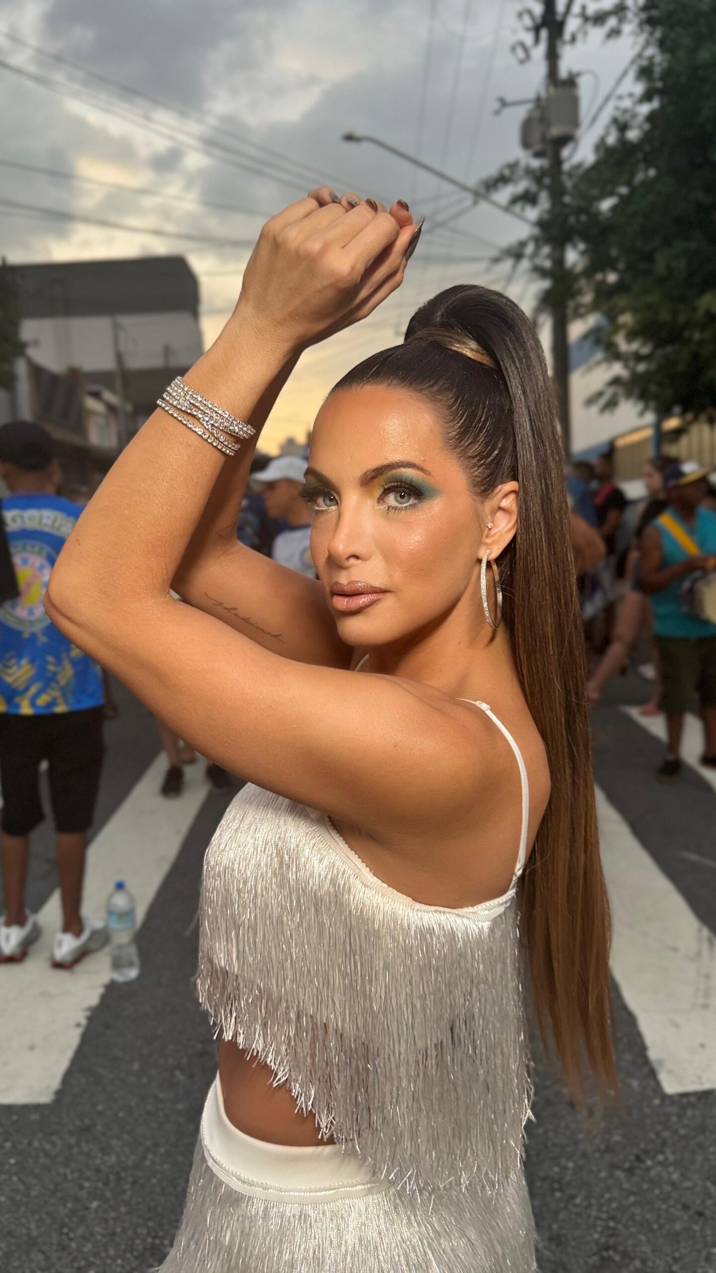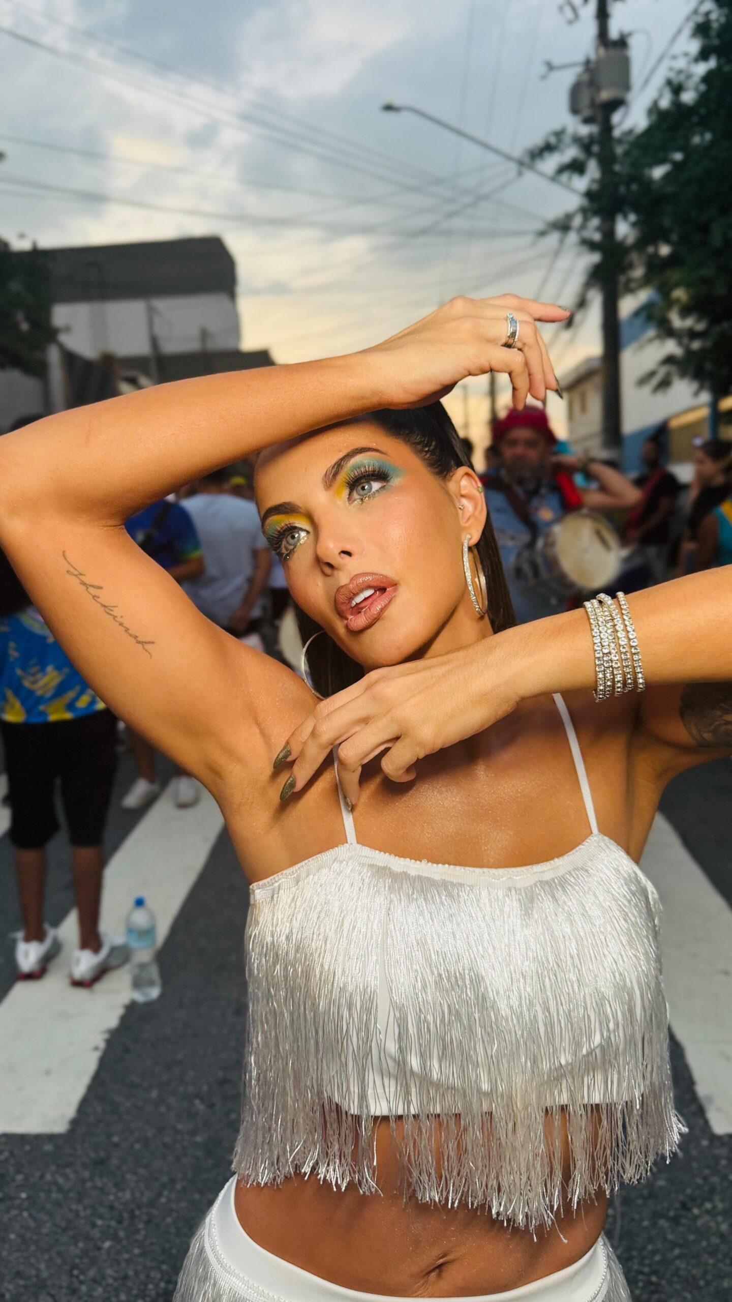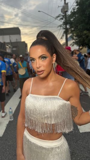 A apresentadora do Pod Trash escolheu look branco trabalhado em franjas estilo melindrosa para cair no samba