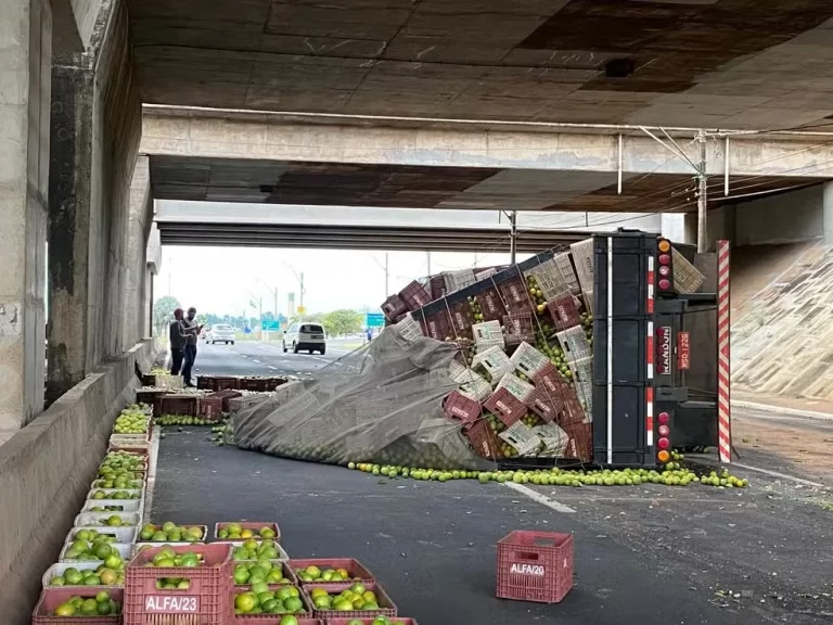 Carreta com mais de 21 toneladas de laranja tomba em avenida