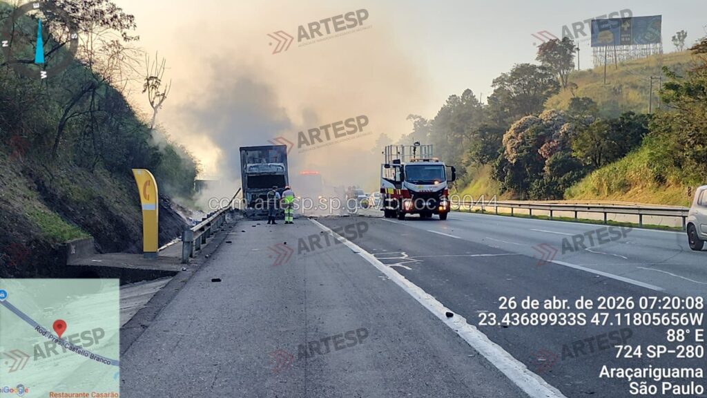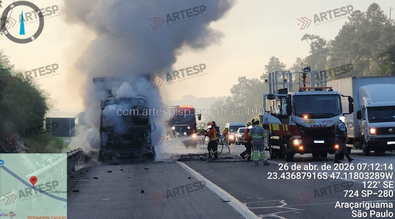 Araçariguama (SP) carreta pega fogo e interdita Rodovia Castello Branco, a ocorrência — Incêndio em Veículo Rodovia Castello Branco (SP- 280) km 55 no Município de Araçariguama-SP