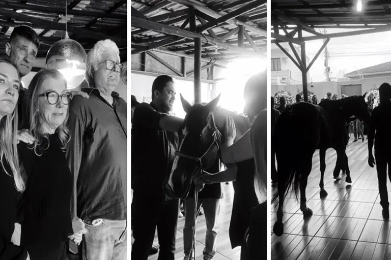 o momento em que o cavalo vai até o caixão da tutora. Ele é conduzido pelos pais da menina, junto com treinadores do animal. O velório ocorreu no sábado (19).