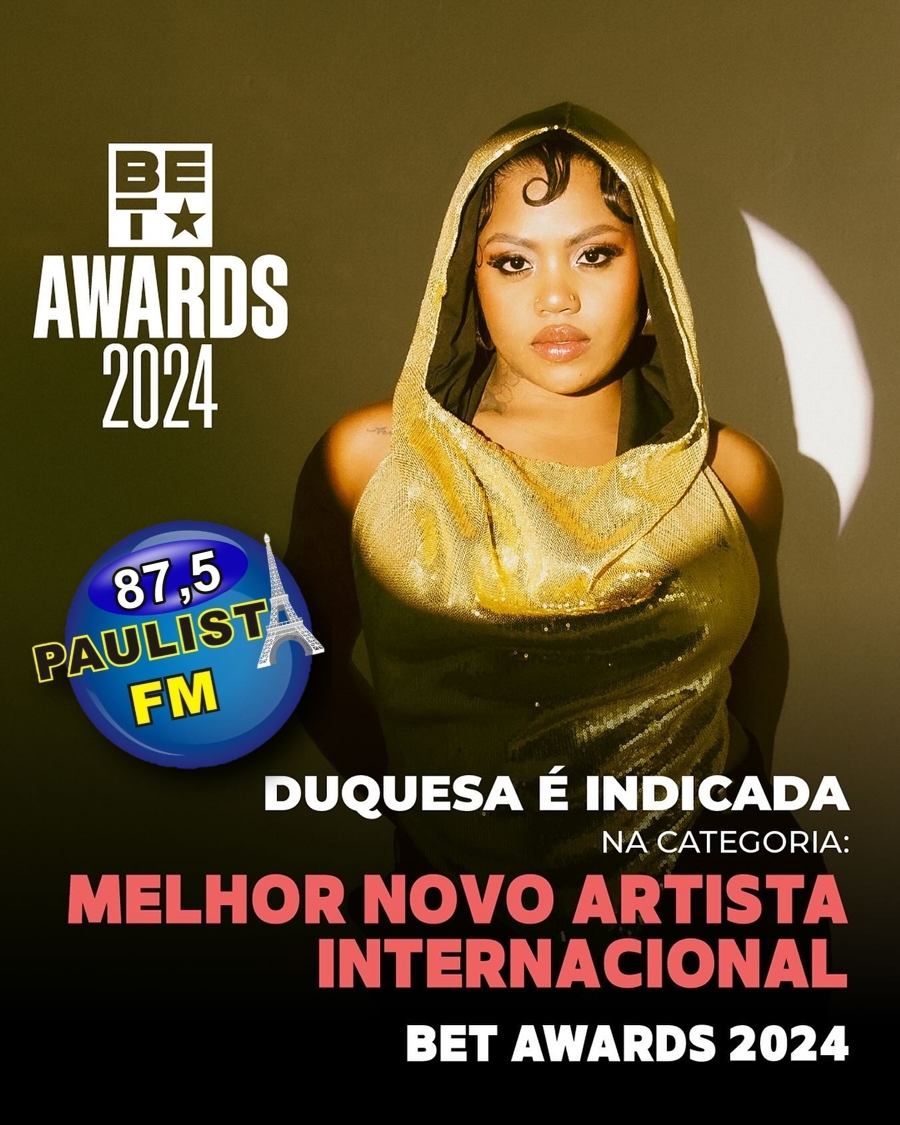 “Eu já nasci pronta”. Esta frase ecoa nos versos de “Classudona”, faixa do álbumTAURUS(2023),deDuquesa, mas, agora, passa a fazer ainda mais sentido porque a cantora baiana acaba de ser indicada aoBET Awards 2024— premiação internacional criada em 2001 pela Black Entertainment Television para premiar artistas afro-americanos da música, cinema, esporte e outras áreas do mercado de entretenimento. Os artistas Bellah (Reino Unido), Cristale (Reino Unido), Holly G (França), Jungeli (França), Makhadzi (África do Sul), Oruam (Brasil), Seyi Vibez (Nigéria) e Tyler Icu (África do Sul) também concorrem na mesmacategoria: a “Viewer’s choice:Best New International Act” (Escolha do público: Melhor Novo Artista Internacional). A votação tem início no dia6 de junhoe os vencedores serão anunciados durante o evento em Los Angeles (EUA), no dia30 de junho, com transmissão ao vivo no site oficial da premiação (acesse aqui). Duquesa faz parte do time de artistas da produtoraBoogie Naipe, que está por trás de nomes como Racionais MC’s e Mano Brown.