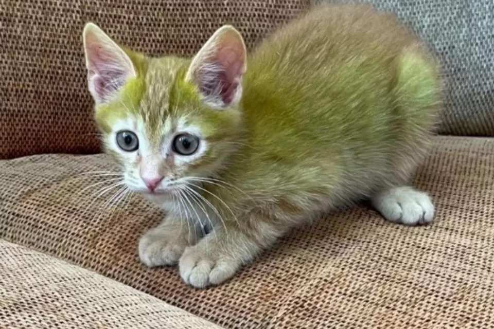 Foto colorida de um gato com pelo verde – Metrópoles