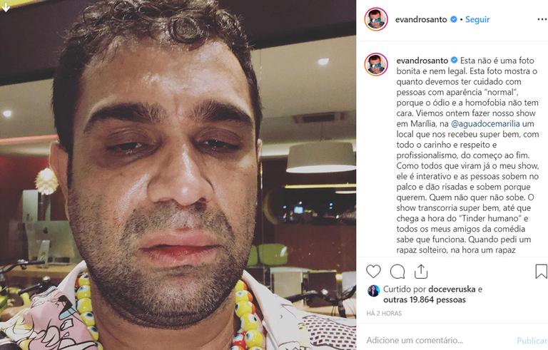 Evandro surgiu com hematomas no rosto e afirmou que vai fazer a denúncia na delegacia, além de abrir um processo por homofobia.