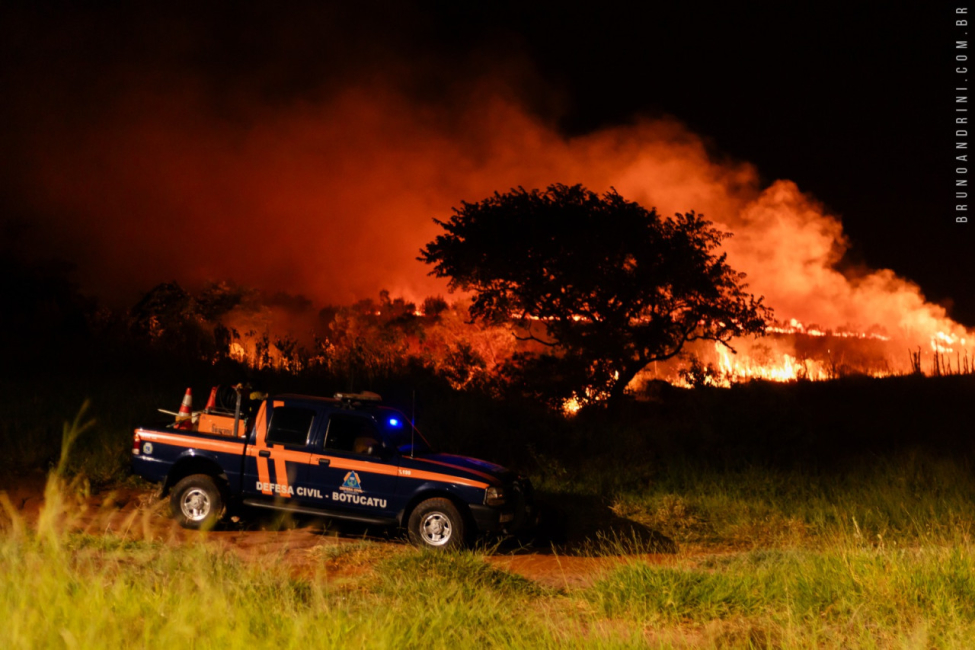 Um incêndio de grandes proporções atingiu na noite deste domingo (07) uma extensa área de mata no bairro Bem-Te-Vi em Botucatu.