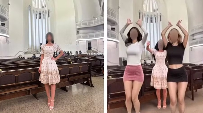 Outra jovem relatou à ao g1 ter sido alvo do mesmo tipo de montagem. No caso dela, o influencer usou uma foto em que ela aparece de blusa de mangas compridas e saia longa, apoiada no banco da igreja, e criou um novo vídeo.
