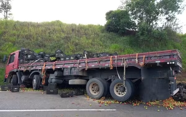 O veículo estava carregado com tomates e a carga ficou espalhada na faixa dois e acostamento. A vítima morreu no local.