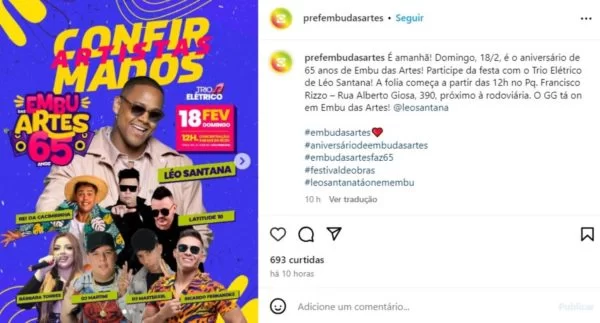Procurada pelo Metrópoles, a Prefeitura de Embu das Artes não retornou sobre a decisão. O espaço segue aberto para eventuais esclarecimentos. Nas redes sociais da administração, até a tarde deste sábado (17/2), ainda constavam anúncios sobre o show de Léo Santana