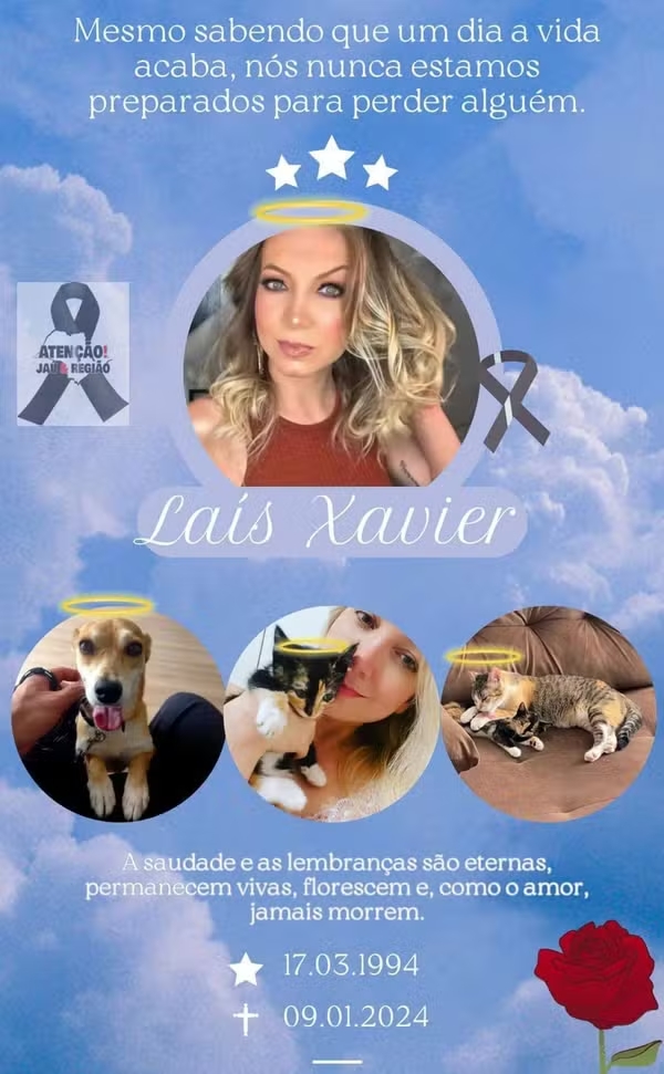 Laís Cristina Agostinho Xavier, de 29 anos, perdeu o controle da direção e capotou na Rodovia Marechal Rondon (SP-300), em Presidente Alves (SP). Ela estava com seus animais de estimação, dois gatos e um cachorro, que também morreram no acidente.