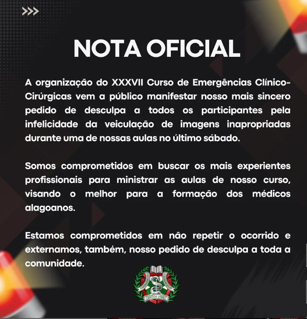 Em nota, a organização do XXXVII Curso de Emergências Clínico-Cirúrgicas pediu desculpas pelo episódio de “infelicidade” da veiculação de “imagens inapropriadas” durante uma aula. Eles reforçaram ainda que estão comprometidos “em não repetir o ocorrido”.