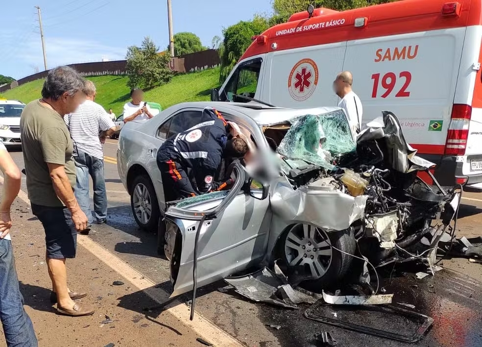 Uma mulher morreu e um homem ficou gravemente ferido após colisão frontal entre carro e caminhão que transportava carga viva em Taquarituba (SP), na manhã desta quinta-feira (11).
