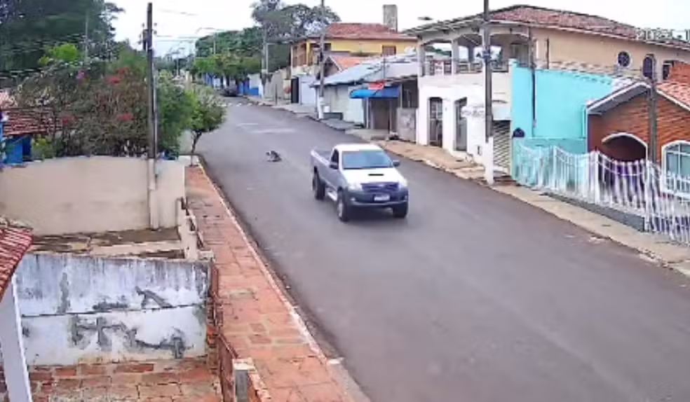 Câmera de segurança registrou o momento em que a cadela foi atropelada, na manhã de segunda-feira (28), em Sarutaiá (SP). — Foto: Reprodução/Câmera de Segurança