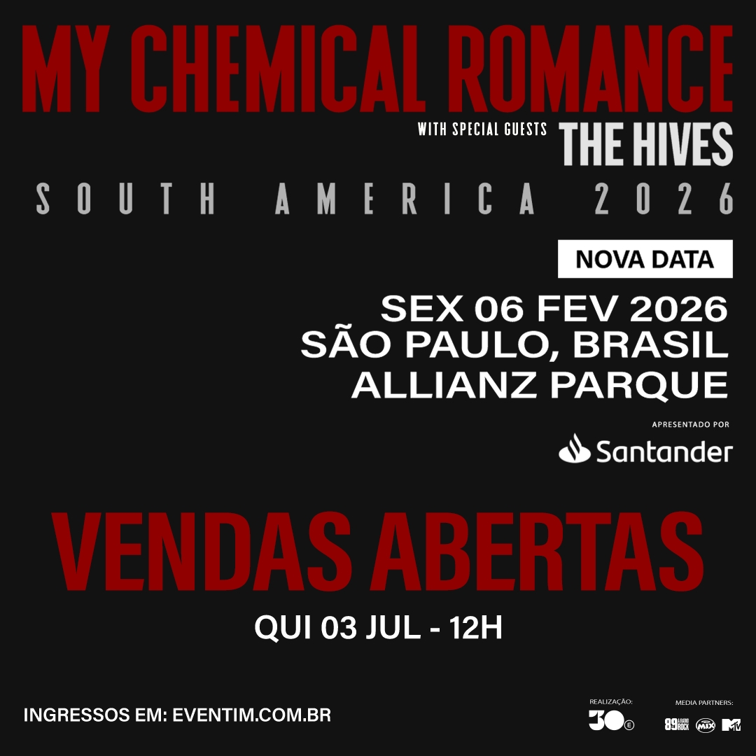 Após sold-out da apresentação de 5 de fevereiro de 2026, a 30e, maior companhia brasileira de entretenimento ao vivo, anuncia a abertura de vendas da segunda data do My Chemical Romance no Allianz Parque, em São Paulo. Os ingressos para a noite de 6 de fevereiro de 2026, também apresentado pelo Santander Brasil, estão disponíveis a partir de hoje (3/07), ao meio-dia, no site da Eventim (acesse aqui).