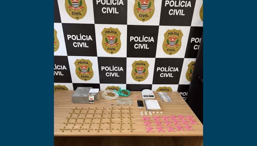De acordo com os policiais civis, durante o cumprimento de um mandado de busca e apreensão domiciliar, foram recolhidas porções de K2, crack, cocaína e maconha , além de dinheiro, balança de precisão, embalagens para fracionamento e um caderno com anotações do tráfico.