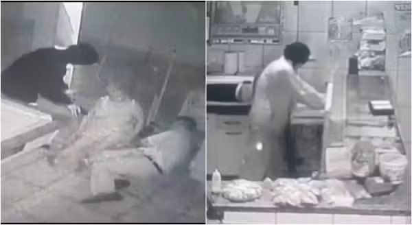 Nas imagens, é possível ver que dois homens encapuzados e armados invadem o comércio e empurram o dono do local, que também é agredido com chute após cair. Em seguida, o criminoso revista a vítima e pega a chave de um carro (veja acima).