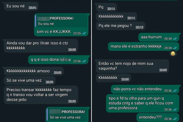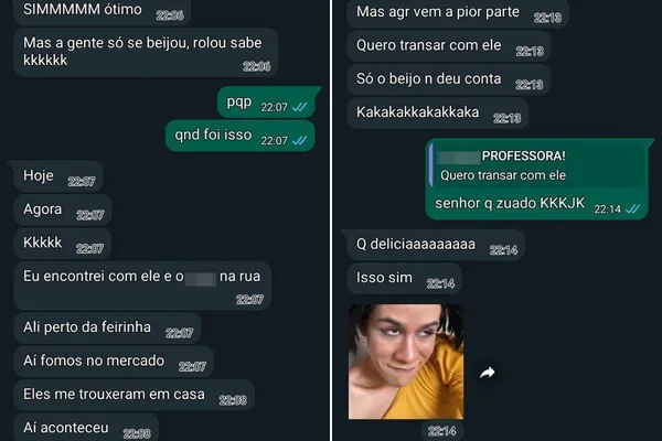 Uma professora de artes foi demitida após beijar um estudante de 14 anos de idade do 9º ano do ensino fundamental de uma escola municipal em Praia Grande, no litoral de São Paulo. Segundo o g1 apurou, a professora contou sobre o beijo por mensagem de texto enviada a uma aluna. Na conversa, a docente afirmou que queria “transar com ele” (veja a troca de mensagens abaixo).