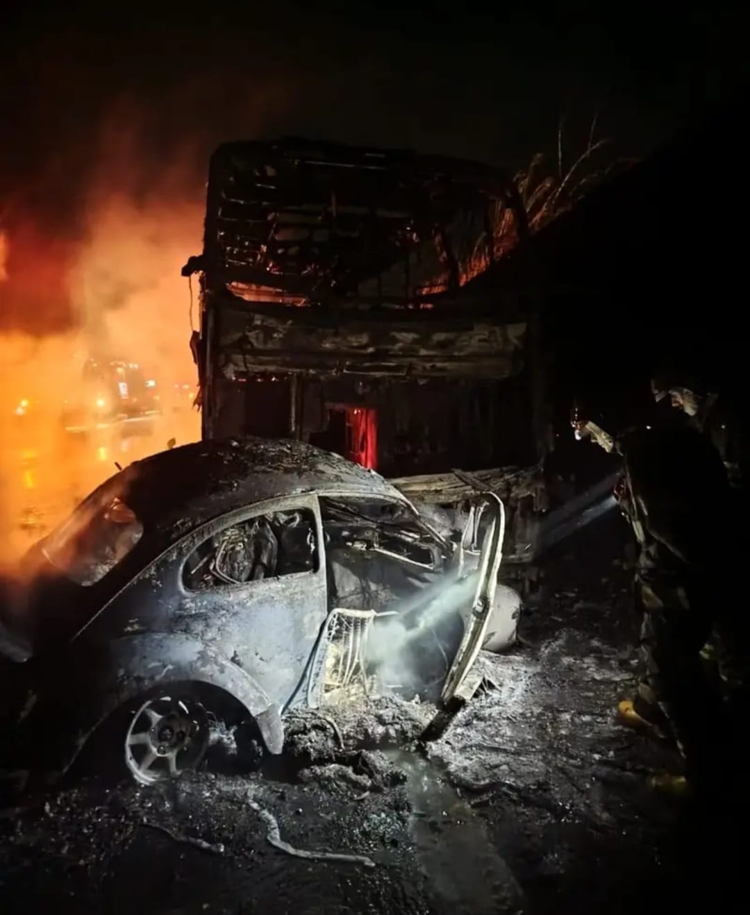 Segundo o Centro de Controle da Artesp, um ônibus rodoviário e um Fusca colidiram de frente, resultando em vazamento de combustível, houve o incêndio. Os dois ocupantes do veículo morreram no acidente. Já entre os 35 ocupantes do ônibus, dois ficaram feridos.