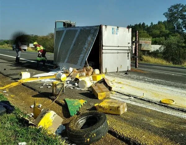 Caminhão carregado de tinta látex tomba e deixa duas pessoas feridas em rodovia de Tatuí