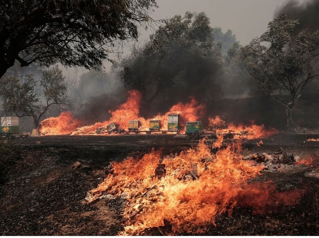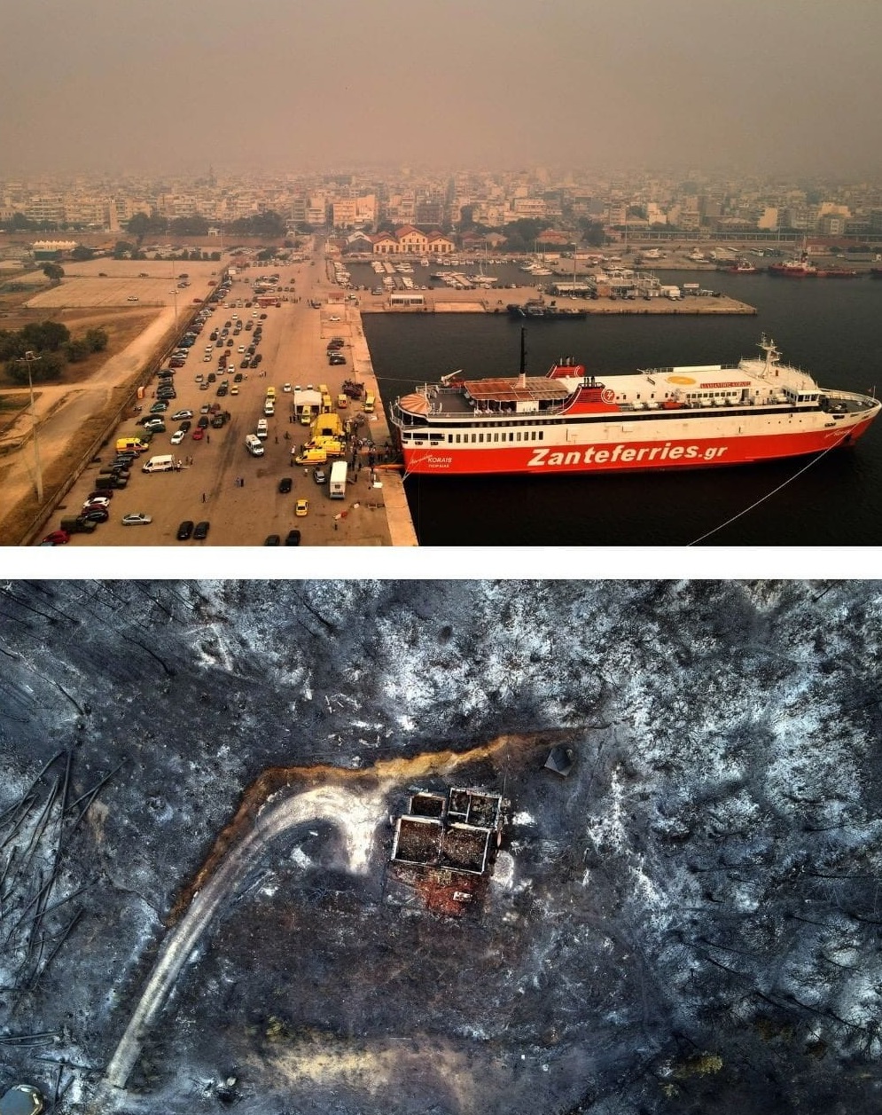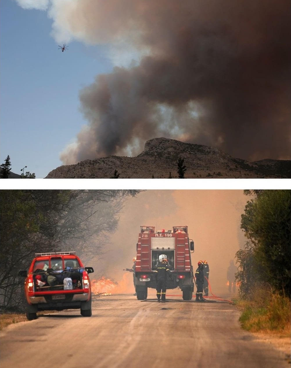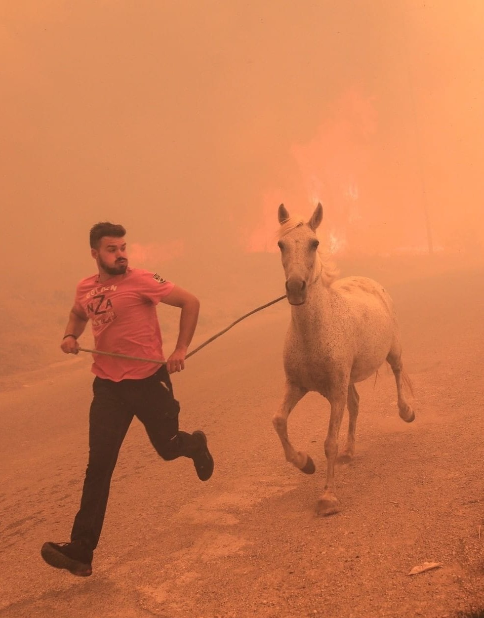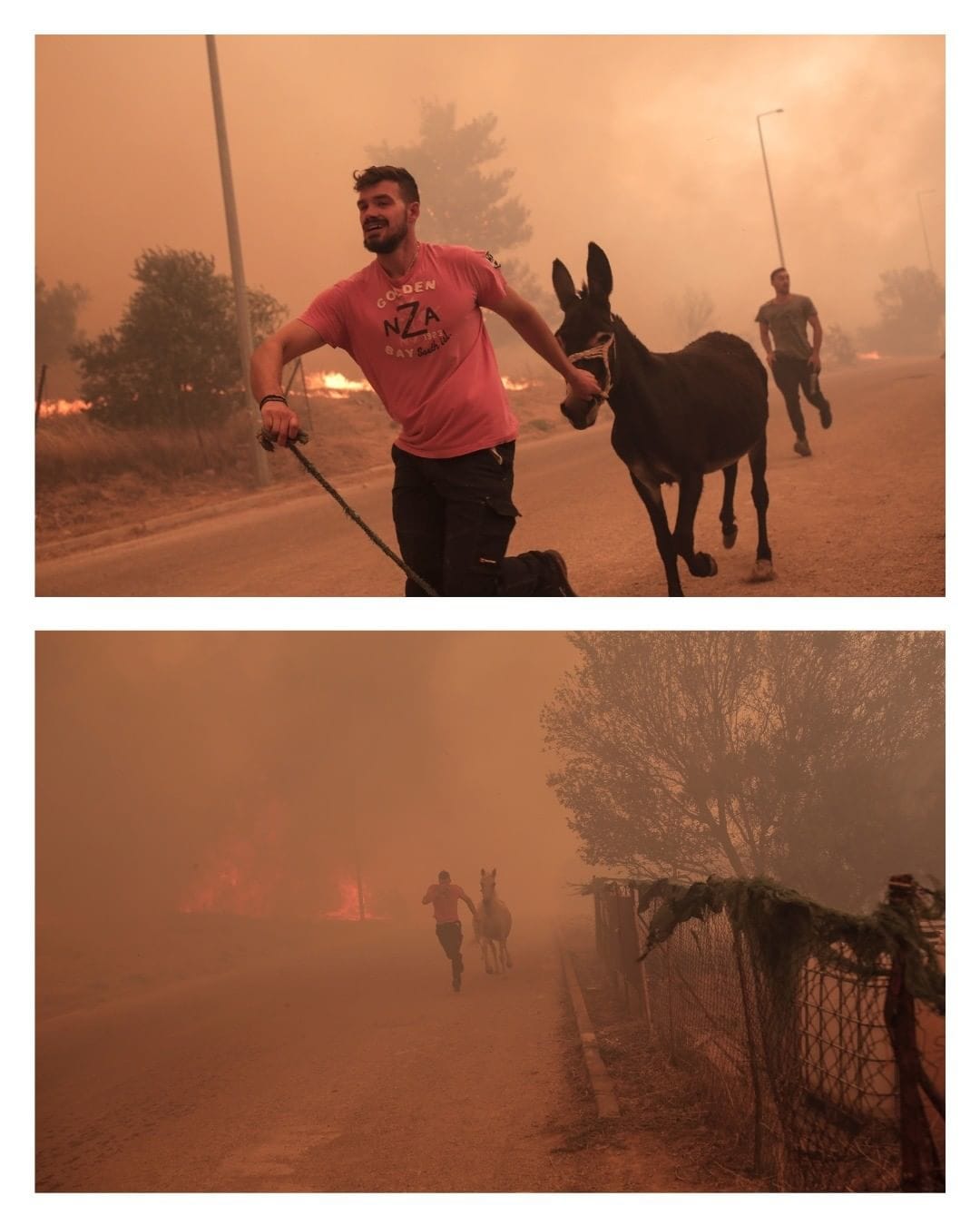 Um agricultor corre para salvar os seus animais do incêndio florestal que deflagrou na zona de Fyli, perto de Atenas, num dia em que a Comissão Europeia anunciou ter mobilizado mais aeronaves da frota da União Europeia e mais bombeiros para apoiar a Grécia no combate aos fogos que ardem em várias zonas do país. No total, nos últimos dois dias, Bruxelas disponibilizou às autoridades gregas sete aviões, um helicóptero, 114 bombeiros e 19 veículos.