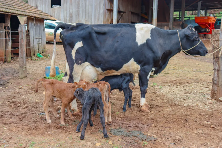 Uma vaca deu à luz quatro bezerros de uma só vez em São Valentim, município localizado no norte do Rio Grande do Sul. Todos os animais são machos.